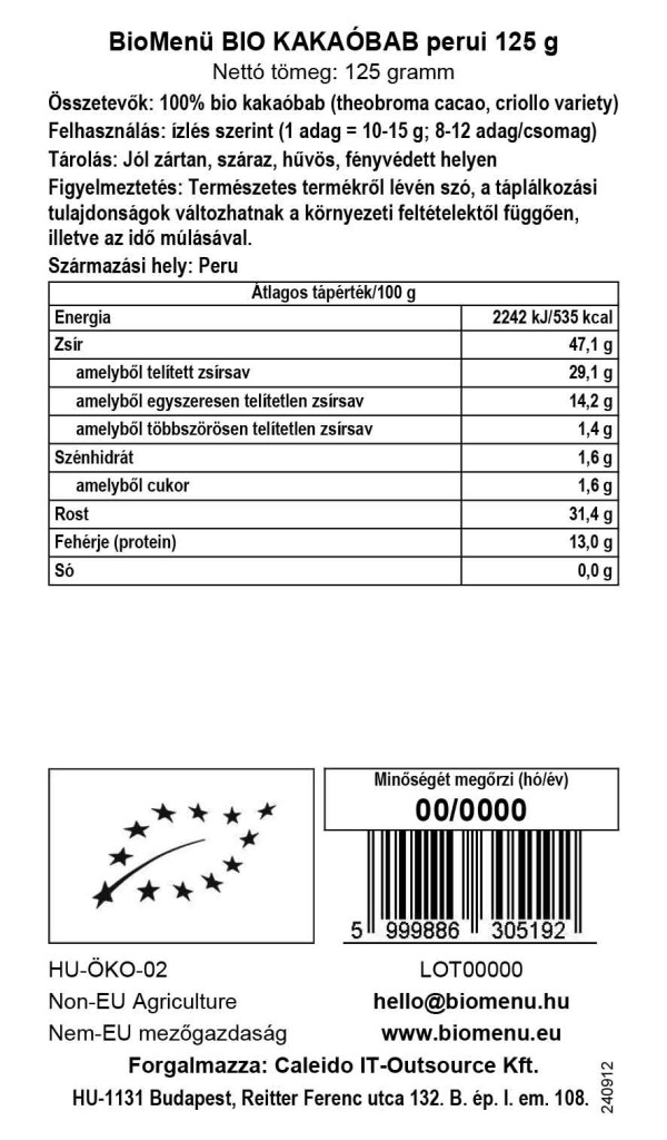 Die Bio-Kakaobohnen von BioMenü werden aus der Sorte Criollo-Kakao hergestellt, die aufgrund ihrer hervorragenden Qualität auch als „König“ des Kakaos bezeichnet wird. Kakao besteht zu 50 % aus drei Fettarten, die für unseren Körper nicht schädlich sind und den Cholesterinspiegel nicht erhöhen (Ölsäure, Stearinsäure und Palmitinsäure), außerdem enthält er mehrere Aminosäuren (Tryptophan und Arginin). ). In roher Form ist es sehr gesund und äußerst reich an antioxidativen Flavonoiden.