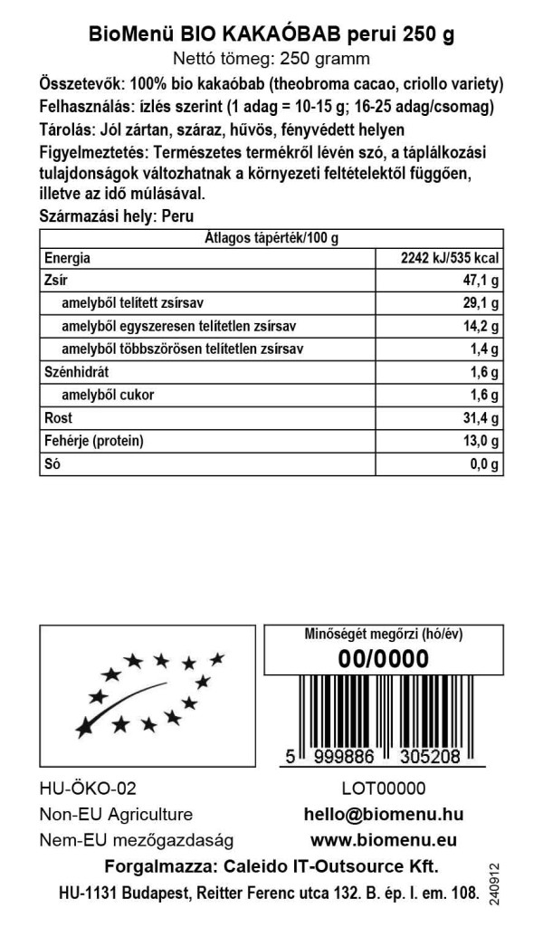 Die Bio-Kakaobohnen von BioMenü werden aus der Sorte Criollo-Kakao hergestellt, die aufgrund ihrer hervorragenden Qualität auch als „König“ des Kakaos bezeichnet wird. Kakao besteht zu 50 % aus drei Fettarten, die für unseren Körper nicht schädlich sind und den Cholesterinspiegel nicht erhöhen (Ölsäure, Stearinsäure und Palmitinsäure), außerdem enthält er mehrere Aminosäuren (Tryptophan und Arginin). ). In roher Form ist es sehr gesund und äußerst reich an antioxidativen Flavonoiden.