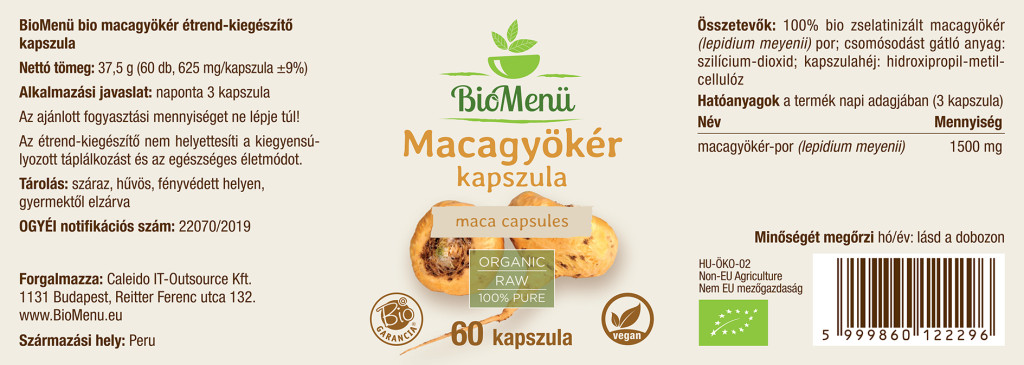 100% organisches gelatiniertes Maca-Wurzelpulver (Lepidium meyenii); Trennmittel: Siliziumdioxid; Kapselhülle: Hydroxypropylmethylcellulose